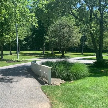A park landscape showcasing a light post with trees visible in the background.